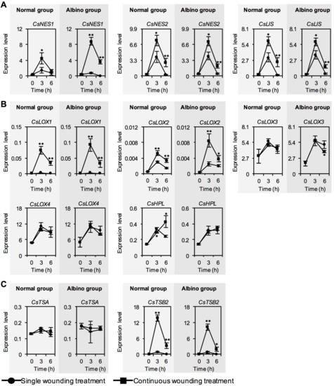 Changes in expression level of characteristic aroma compound biosynthetic genes of normal tea leaves and albino tea leaves exposed to single wounding treatment and continuous wounding treatment, respectively. Data are expressed as mean ± SD (n =3). * p ≤ 0.05; ** p ≤ 0.01, comparison between single wounding treatment and continuous wounding treatment at the same treatment time. NES, (E)-nerolidol synthase; LIS, linalool synthase; LOX, lipoxygenase; HPL, hydroperoxide lyase; TSA, tryptophan synthase α-subunit; TSB, tryptophan synthase β-subunit. (A) Genes involved in formations of volatile terpenes. (B) Genes involved in formations of volatile fatty acid derivatives. (C) Genes involved in formation of indole.