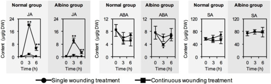 Changes in contents of phytohormones of normal tea leaves and albino tea leaves exposed to single wounding treatment and continuous wounding treatment, respectively. Data are expressed as mean ± SD (n =3). * p ≤ 0.05; ** p ≤ 0.01, comparison between single wounding treatment and continuous wounding treatment at the same treatment time. JA, jasmonic acid; ABA, abscisic acid; SA, salicylic acid.