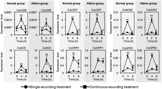 Changes in expression level of jasmonic acid (JA) biosynthetic genes of normal tea leaves and albino tea leaves exposed to single wounding treatment and continuous wounding treatment, respectively. Data are expressed as mean ± SD (n =3). * p ≤ 0.05; ** p ≤ 0.01, comparison between single wounding treatment and continuous wounding treatment at the same treatment time. LOX, lipoxygenase; AOS, allene oxide synthase; AOC, allene oxide cyclase; OPR, 12-oxo-phytodienoic acid reductase.
