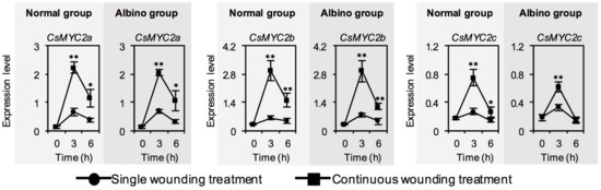 Changes in expression level of CsMYC2, a key transcription factor of jasmonic acid (JA), of normal tea leaves and albino tea leaves exposed to single wounding treatment and continuous wounding treatment, respectively. Data are expressed as mean ± SD (n =3). * p ≤ 0.05; ** p ≤ 0.01, comparison between single wounding treatment and continuous wounding treatment at the same treatment time.