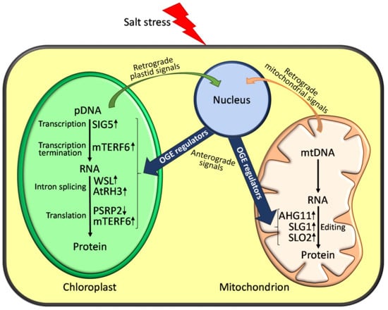Schematic representation of the cellular functions of OGE regulators in plant response to salinity. Salt stress can perturb chloroplast or mitochondrion homeostasis and this would be communicated to the nucleus through retrograde signals, leading to changes in nuclear gene expression. In turn, this would activate the expression of OGE regulators (e.g., mTERFs, PPRs or DEAD-box RHs proteins), which would result in anterograde signalling responses to adjust organellar function to salinity. In the figure, inside a mitochondrion (purple) and chloroplast (green), only those molecularly-characterized OGE regulators whose mutations lead to altered responses to salinity are depicted. The OGE processes affected in these mutants, as well as their enhanced (↑) or reduced (↓) sensitivity to salt stress, are shown (see also Table 1 for further information).