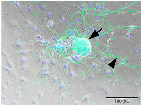 Overlay of phase-contrast and immunofluorescence-images of a non-infected, non-cryopreserved canine DRG neuron at 6 DiV: green = pan-NF; blue = bisBenzimide nuclear stain. The neuron has a large, granular cell body with a phase-bright halo (arrow), is adherent to the substrate, and shows outgrowth of branched neurites (arrowhead). It is surrounded by spindeloid, bi- to multipolar glial cells with delicate processes (blue nuclei) lacking neurofilament staining. Pan-NF = pan-neurofilament, DiV = days in vitro, DRG = dorsal root ganglion.