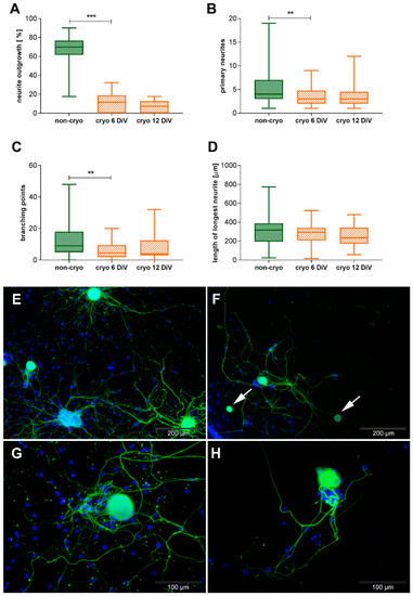 Comparative morphometric analysis of non-infected non-cryo (6 DiV) and cryo (6 and 12 DiV) neurons. A: Y axis: neurons showing neurite outgrowth [%]. Non-cryo cultures contain a higher percentage of neurons showing neurite outgrowth compared to cryo cultures. Non-cryo 6 DiV, cryo 6 DiV, and cryo 12 DiV: n = 24 wells. B: Y axis: number of primary neurites per neuron. Among the neurons showing neurite outgrowth, non-cryo neurons possess a higher number of primary neurites per neuron. Non-cryo: n = 72 neurons, cryo 6 DiV: n = 24 neurons, cryo 12 DiV: n = 37 neurons. C: Y axis: number of neurite branching points per neuron. Non-cryo neurons form a higher number of neurite branching points per neuron than cryo neurons. Non-cryo: n = 72 neurons, cryo 6 DiV: n = 24 neurons, cryo 12 DiV: n = 37 neurons. D: Y axis: length of longest neurite [µm] per neuron. Non-cryo and cryo neurons show no significant difference in the mean length of their longest neurite. Non-cryo: n = 72 neurons, cryo 6 DiV: n = 24 neurons, cryo 12 DiV: n = 37 neurons. E–H: Immunofluorescence-images of non-cryo (E,G) and cryo neurons (F,H) at 6 DiV; green = pan-NF, blue = bisBenzimide nuclear stain. More neurons without neurites (F: arrows) can be found in cryo cultures. Cryo neurons generally show fewer and less branched neurites and smaller cell bodies (F,H) compared to non-cryo neurons (E,G). ** = p < 0.01, *** = p < 0.001. Employed statistical test: Mann–Whitney U-test. Pan-NF = pan-neurofilament, DiV = days in vitro, non-cryo = non-cryopreserved, cryo = cryopreserved. Graphs show median value, quartils, minimum and maximum values.