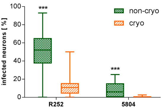 Y axis: neurons infected with different CDV strains [%] at 6 dpi. Cryo neurons show reduced susceptibility to infection with both CDV-strains (CDV R252 and CDV-5804 PeGFP) when compared to non-cryo neurons. Generally CDV R252 infects a higher percentage of neurons than CDV-5804 PeGFP. Non-cryo and cryo: n = 24 wells. *** = p < 0.001. Employed statistical test: Mann–Whitney U-test., dpi = days post infection, non-cryo = non-cryopreserved, cryo = cryopreserved, CDV = canine distemper virus, eGFP = enhanced green fluorescent protein. Graphs show median value, quartils, minimum and maximum values.