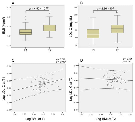 Adiposity traits. (A) BMI and (B) LDL-C were increased from time point T1 to T2 during mid-to-late gestation. Box and whisker plots illustrate medians, minimum values, maximum values, and interquartile ranges. Scatter plots showing the relationship between BMI and LDL-C at (C) T1 and (D) T2. (C,D) Because of the right-skewness, BMI and LDL-C were log transformed. Solid line, a regression line; dotted line, 95% confidence intervals. Statistics were calculated using (A,B) paired t-testing and (C,D) regression analysis. (BMI, body mass index; LDL-C, low-density lipoprotein cholesterol).