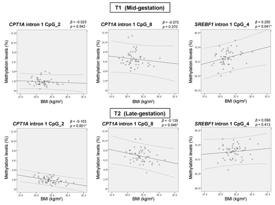 For CpG_2 and CpG_8 of CPT1A intron 1 and CpG_4 of SREBF1 intron 1, we analyzed the association of methylation levels with BMI at the two time points T1 and T2 (Figure 2). The direction of association between BMI and the methylation of CPT1A was negative, while that of SREBF1 intron 1 was positive, indicating that we reproduced the association trend identified in EWAS. The magnitude of this association was small (within ±0.3% methylation increase per 1 kg/m2 BMI increase), which was also consistent with the previous reports. The association of BMI with methylation levels was significant at T1 for CpG_4 of SREBF1 (p = 0.041) and at T2 for CpG_2 (p = 0.001) and CpG_8 (p = 0.046) of CPT1A intron 1. Next, we analyzed the association between serum LDL-C and methylation levels of the same CpG sites along with the CpG sites in CPT1A exon 15 (Figure S2). At mid-gestation (T1), the overall relationship of CPT1A and SREBF1 intron 1 methylations with LDL-C was largely similar to that with BMI. A significant association between SREBF1 CpG_4 methylation and LDL-C was also detected at T1 (p = 0.023). At late gestation (T2), the association of SREBF1 CpG_4 methylation with adiposity, with regard to both BMI and LDL, was weakened compared to at T1. In contrast, for the association with CPT1A intron 1 methylation at T2, we found great discordance between BMI and LDL-C: the methylation was associated with BMI but not with LDL-C (Figure 2 and Figure S2A). Regarding the methylation level of CpG_2.3 of CPT1A exon 15, which was previously reported to be positively associated with LDL-C, no association was observed in our study (Figure S2B).