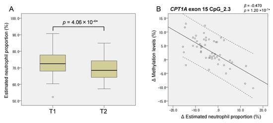 (A) Estimated neutrophil proportions at two specific time points during pregnancy. Box and whisker plots illustrate medians, minimum values, maximum values, and interquartile ranges. (B) Association of CPT1A exon 15 methylation change and neutrophil proportion change from T1 to T2. β indicates methylation change (%) per unit (1%) increase in neutrophil proportion from T1 to T2. Solid, a regression line; dotted, 95% confidence intervals. Statistics were calculated using (A) paired t-testing and (B) regression analysis.