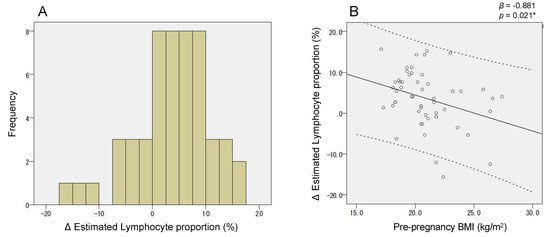 Intra-individual lymphocyte proportion change during mid-to-late gestation was associated with pre-pregnancy BMI. (A) Histogram of estimated lymphocyte proportion change (∆ lymphocyte proportion) (%). (B) Association between pre-pregnancy BMI and estimated lymphocyte proportion change (∆ lymphocyte proportion).