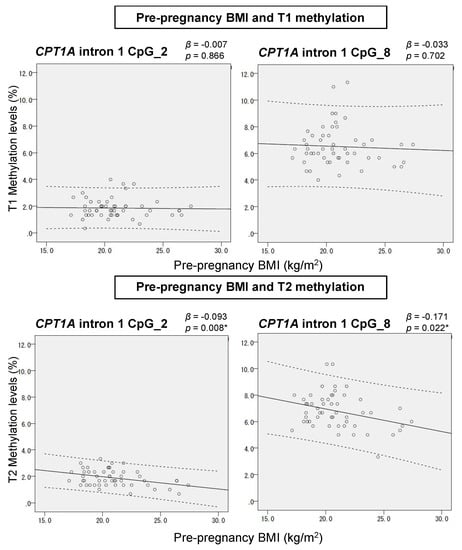 Scatter plots showing the relationship between pre-pregnancy BMI and CPT1A intron1 methylation. Solid line, a regression line; dotted line, 95% confidence intervals. The scale is adjusted to the methylation for each CpG site. β (regression coefficient) stands for the % change in methylation per unit increase (1 kg/m2) in BMI.