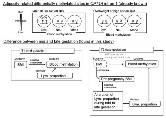 Here, we performed a prospective cohort study of pregnant women and investigated the association of methylation in CPT1A and SREBF1 with adiposity traits during mid-to-late gestation. Although gestational weight gain does not occur only due to an increase in fat mass [], we mainly observed the same trend as reported in obesity-related EWAS findings at mid-gestation for the association of those methylation levels with BMI and LDL-C. However, during late gestation, while the association of methylation with adiposity traits was mostly weakened, only CPT1A intron 1 methylation showed a significant association with BMI. Unique to late gestation, it was revealed that the lymphocyte proportion was an intermediary step in the causal pathway from BMI (exposure) to the methylation outcome, which is a different situation from usual cases where the lymphocyte proportion can be considered as a covariate (or a confounding factor) (this description uses statistical terms in the context of causal inference). CPT1A exon 15 methylation was influenced by leukocyte composition but associated with neither BMI nor LDL-C. In this study, we demonstrate a unique example of a candidate gene methylation analysis by tracing the same individuals and simultaneously assessing the leukocyte composition, which has not always been carefully conducted. With this approach, we have successfully shown that the blood methylation of adiposity-related differentially methylated CpGs during mid-to-late gestation followed metabolic and immunological alteration with advancing gestation.
