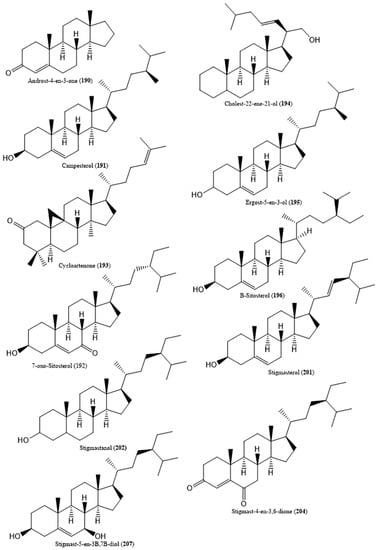 - Singariya, P.; Kumar, P.; Mourya, K.K. Isolation of some new steroids and evaluation of bio-activity of Cenchrus ciliaris. Int. J. Res. Pharm. Sci. 2013, 3, 678–684. [Google Scholar]