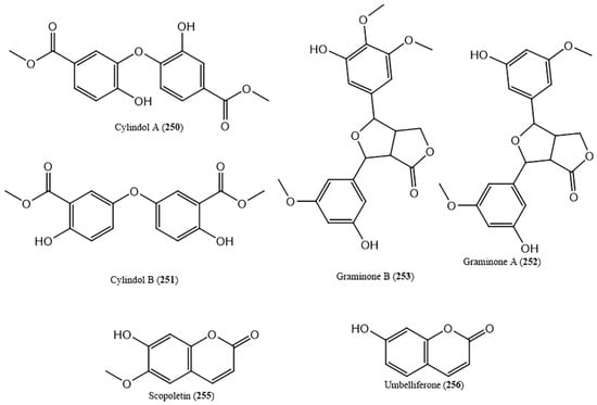- Matsunaga, K.; Shibuya, M.; Ohizumi, Y. Graminone B, a novel lignan with vasodilative activity from Imperata cylindrica. J. Nat. Prod. 1994, 57, 1734–1736. [Google Scholar] [CrossRef] [PubMed]