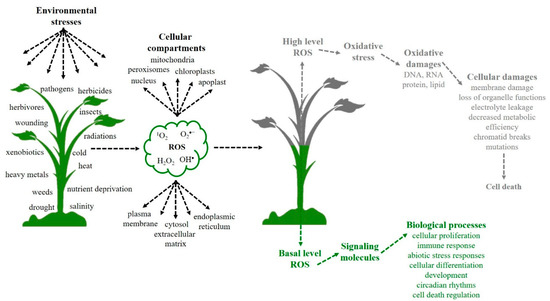ROS such as singlet oxygen (1O2), superoxide radical (O2•−), hydrogen peroxide (H2O2), and hydroxyl radical (OH•) are partially reduced or excited forms of atmospheric oxygen and considered to be toxic molecules [3]. These molecules have different levels of reactivity, sites of production, and the potential to cross biological membranes [3]. ROS are mainly formed in organelles with high electron flux such as chloroplasts, mitochondria, and peroxisomes [3,4], but also in plant cells in the plasma membrane, cell wall, cytosol, apoplast, endoplasmic reticulum, nucleus, and extracellular matrix (Figure 1) [3,4,22].
