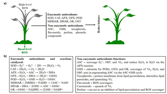 Enzymatic antioxidants include superoxide dismutase (SOD), catalase (CAT), ascorbate peroxidase (APX), glutathione peroxidase (GPX), peroxidase (POD), peroxiredoxin (PRX), monodehydroascorbate reductase (MDHAR), dehydroascorbate reductase (DHAR), glutathione reductase (GR), and glutathione-S-transferase (GST) [2,4,22]. SODs are enzymes that catalyze the dismutation of O2•− to H2O2. Thus, SODs enzymes are at the frontline in the defense against ROS. CAT enzymes catalyze the dismutation of two H2O2 molecules to water and O2. These enzymes are localized mainly in peroxisomes. APXs play a key role catalyzing the conversion of H2O2 into H2O using the ascorbate as a specific electron donor. APXs are distributed in chloroplasts, mitochondria, peroxisomes, and the cytosol, coding different isoforms. GPXs catalyze the reduction of H2O2 or organic hydroperoxides to H2O. GPXs are nonheme thiol peroxidases and in plants are localized to mitochondria, chloroplasts, and cytosol. PODs are involved in H2O2 detoxification. Also, PODs can perform a second cyclic reaction, the hydroxylic reaction, this is distinct from the peroxidative reaction. Further, these enzymes are involved in the biosynthesis of lignin and defense against biotic stresses by consuming H2O2. MDHARs catalyze the regeneration of ascorbic acid (ASC) from the monodehydroascorbate radical using NAD(P)H as an electron donor. Thus, MDHARs play an essential role in the antioxidant system to maintain the ascorbate pool. DHARs are thiol enzymes that maintain the ascorbate in reduced form. DHARs catalyze the reduction of dehydroascorbate to ascorbate using glutathione (GSH) as a reducing substrate. GR enzymes catalyze the reduction of oxidized glutathione (GSSG) to reduced GSH. GRs are a NAD(P)H-dependent enzyme that protects cells against oxidative damage [2,4,25,26,27,28]. Also, GSTs are isozymes known to protect cells against chemical-induced toxicity. These enzymes catalyze the conjugation of GSH to a variety of electrophilic and hydrophobic substrates [29]. Accordingly, the action of the cellular antioxidant machinery is essential to control excess ROS to protect plant cells from oxidative damage and to restore the redox homeostasis.