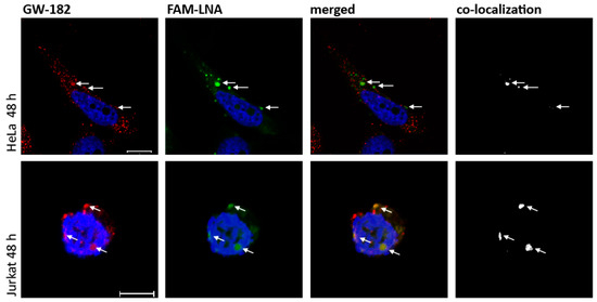 Next, we wanted to analyze whether the “nakedly” delivered LNA mixmers and cytoplasmic GW-bodies known to contain RNA degrading enzymes co-localize. The reasons for addressing this question were first that glycine-tryptophan protein of 182 kDa (GW-182, GW-body marker) co-localized with gymnotically-delivered LNA gapmers targeting the ApoB or Bcl-2 mRNA in Huh-7 and HT 1080 cells [30,34]. Secondly, the gymnotically-delivered LNA mixmers used here also accumulated within the cytoplasm, and induced RNA degradation in HeLa and Jurkat cells which led to the assumption that the LNA mixmers might also co-localize with GW-bodies.