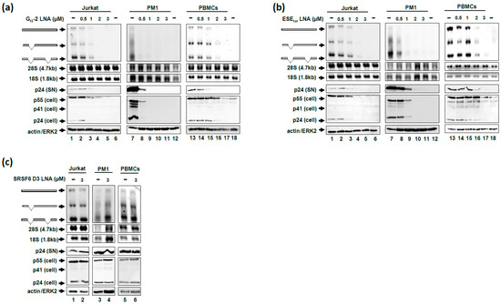 As shown in Figure 4, the “nakedly” delivered GI3-2 (Figure 4a) and ESEtat (Figure 4b) LNA mixmers dramatically interfered with viral RNA expression and viral p24 CA expression in Jurkat and PM1 cells as well as in PBMCs. Both LNA mixmers, at a concentration of 1 or 2 μM, reduced the amount of all three viral RNA classes and p24 CA protein levels in Jurkat cells and in PBMCs (Figure 4a,b, cf. lane 1 with lanes 3–5 and lane 13 with lanes 15–17). The LNA-mediated antiviral effect was even stronger in PM1 cells affecting viral RNA expression and replication already at a concentration of 0.5 µM (Figure 4a,b, cf. lane 7 with lanes 8–11). On the contrary, when the SRSF6 D3 LNA was gymnotically-delivered at the highest concentration (3 µM) we could not observe effects neither on viral RNA expression nor HIV-1 replication (Figure 4c), indicating that not the LNA mixmers per se affect viral replication but the specific binding of the GI3-2 and ESEtat LNA mixmers respectively to their target sequences.
