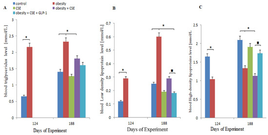 Lipid profile measurements in the blood of female C57BL/6 mice with obesity (the 124th day of the experiment) and obesity + CSE (the 188th day of the experiment): the level of triglycerides in serum (A); low-density lipoprotein level (B); high-density lipoprotein level (C). *—significance of difference compared with control (p < 0.05); ■—significance of difference compared with the obesity + CSE group (p < 0.05).