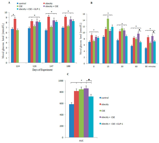The glucose level in the blood of female C57BL/6 mice in the development of obesity and emphysema (A). Oral glucose tolerance test (B) and area under the curve (AUC) (C) on the 186th day of the experiment. *—significance of difference compared with control group (p < 0.05); ■—significance of difference compared with the obesity + CSE group (p < 0.05).
