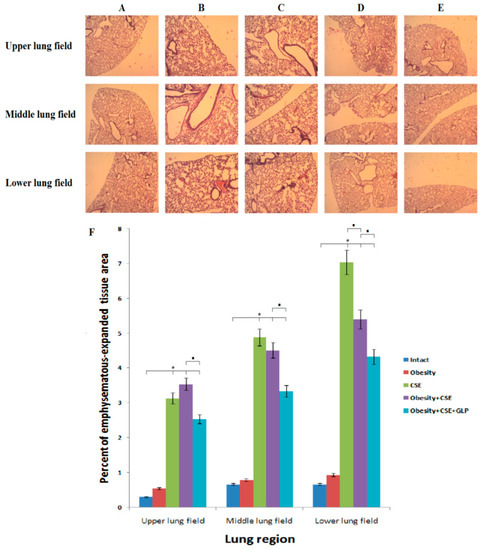 Photomicrographs of left lung sections (upper, middle and lower pulmonary field) obtained from female C57BL/6 mice (n = 6). Tissues were stained with hematoxylin-eosin (188th day of the experiment). (A) Control group; (B) Obesity; (C) CSE; (D) Obesity + CSE; (E) Obesity + CSE + GLP-1; (F) The area of emphysema-expanded lung tissue of mice from all groups. * p < 0.05 significance of difference compared with control group, ■ p < 0.05 significance of difference compared with the obesity + CSE group.