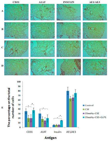 Immunohistochemical staining for specific cellular markers: CD31, α1-antitrypsin (A1AT), insulin, pan-cytokeratin (AE1/AE3) in the lungs from female C57BL/6 mice (brown stain). (A) Control group; (B) CSE; (C) Obesity + CSE; (D) Obesity + CSE + GLP-1. (E) The relative content of cells expressing specific antigens in all groups. * p < 0.05 significance of difference compared with control group, ■ p < 0.05 significance of difference compared with the obesity + CSE group.