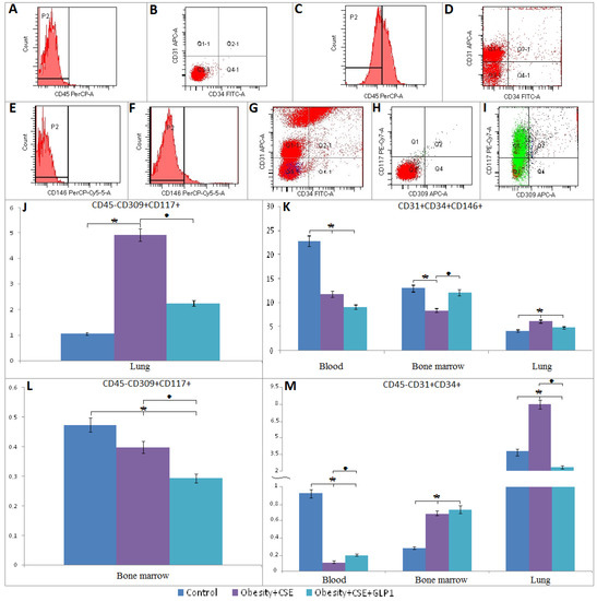 Characterization of endothelial cell population CD31+CD34+CD146+, CD45−CD31+CD34+, CD45−CD117+CD309+ isolated from blood, bone marrow, and lung of female C57BL/6 mice on the 188th day of the experiment. Cells were analyzed by flow cytometry using antibodies for CD45, CD31, CD34, CD146, CD117, CD309 mice. Dot plots are representative for three independent experiments with the mean from three independent experiments. (A,B) Isotypic control for IgG2a (PerCP), IgG2a (FITC) and IgG2b (APC). (C,D) Phenotype establishment and qualitative analysis of CD45 (PerCP), CD34 (FITC) and CD31 (APC) expression. (E) Isotypic control for IgG2a (PerCP-Cy5.5). (F,G) Phenotype establishment and qualitative analysis of CD34 (FITC), CD31 (APC), and CD146 (PerCP-Cy5.5) expression. (H) Isotypic control for IgG2b (PE-Cy7), and IgG2b (APC). (I) Phenotype setting and qualitative analysis of CD45 (PerCP), CD117 (PE-Cy7), and CD309 (APC) expression. (J,L) The content of angiogenesis progenitor cell (CD45−CD117+CD309+) in the lung (J) and bone marrow (L) of control mice, obese mice exposed to CSE, obese mice exposed to CSE and receiving GLP-1. (K) The content of endothelial cells with CD31+CD34+CD146+ phenotype isolated from blood, bone marrow, and lung of control mice, obese mice exposed to CSE, obese mice exposed to CSE and receiving GLP-1. (M) The content of endothelial cells with phenotype CD45−CD31+CD34+ isolated from blood, bone marrow, and lung of control mice, obese mice exposed to CSE, obese mice exposed to CSE and receiving GLP-1. *—significance of difference compared with control (p < 0.05); ■—significance of difference compared with the obesity + CSE group (p < 0.05).