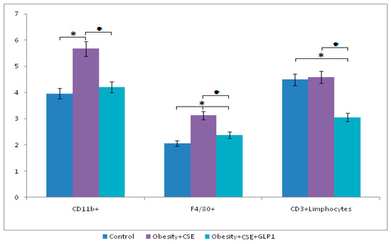 The content of CD11b+ and F4/80+ monocytes, and CD3+ T-lymphocyte in the blood of control mice, obese mice exposed to CSE, obese mice exposed to CSE and receiving GLP-1. *—significance of difference compared with control (p < 0.05); ■—significance of difference compared with the obesity + CSE group (p < 0.05).