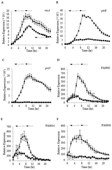 - Wu, W.; Jin, S. PtrB of Pseudomonas aeruginosa suppresses the type III secretion system under the stress of DNA damage. J. Bacteriol. 2005, 187, 6058–6068. [Google Scholar] [CrossRef] [PubMed]