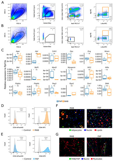 Isolation and characterization of interstitial stem cells from murine skeletal muscle. Gating strategy for FACS (fluorescent activated cell sorting) isolation of murine MABs (mesoangioblasts) and FAPs (fibro/adipogenic progenitors) (A) and control gates (B). (C) qPCR analysis of characteristic genes; values shown as relative expression to Rpl13a. n = 4–6. (D,E) Flow cytometry analysis of characteristic markers. MAB in orange (D), FAP in blue (E) and unstained control samples in grey. (F) Microscopy images of adipogenic differentiation; nuclei are stained with Hoechst (blue), lipids are stained with Oil Red O (red) and adipocytes are stained with Perilipin (green). (G) Microscopy images of myogenic differentiation from the co-culture of mouse MAB or FAP and satellite cells; Myotubes are stained with MyHC (red), MAB or FAP are stained with GFP (green) and nuclei are stained with Hoechst (blue). In (E,F), scale bar, 50 µm. * p ≤ 0.05, ** p ≤ 0.01, t-test.