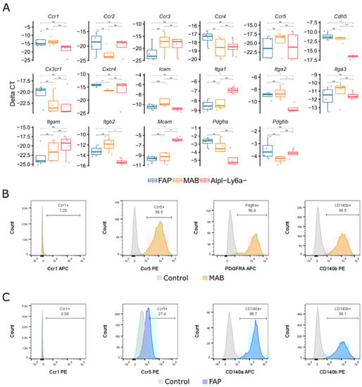 Chemokine receptor screening of interstitial stem cells. (A) qPCR analysis of chemokine receptor genes; values shown as ΔCt, normalized to Rpl13a. n = 4. (B,C) Flow cytometry for chemokine receptors localization on murine MAB (B) and FAP (C). MAB in orange, FAP in blue and unstained control samples in grey. * p ≤ 0.05, ** p ≤ 0.01, *** p ≤ 0.005, **** p ≤ 0.001, t-test.