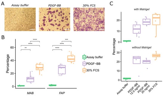 Because both mesoangioblasts and fibro/adipogenic progenitors express PDGFRB and its ligand is upregulated in dystrophic skeletal as well as cardiac muscle, we wanted to check if these cells are able to migrate towards this growth factor. We performed an in vitro migration assay on mesoangioblasts as well as fibro/adipogenic progenitors and assessed their ability to migrate towards PDGF-BB (Figure 5A). Both were able to migrate towards PDGF-BB albeit with different efficiencies (Figure 5B). Additionally, we also confirm the ability of fibro/adipogenic progenitors to invade through Matrigel, although with a lower efficiency as without Matrigel (Figure 5C).