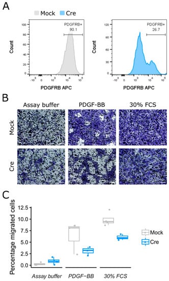 For creating a population of PDGFRB- cells, FAP plated 10,000 cells/cm2 in high-glucose DMEM supplemented with 20 percent FBS (Gibco #10082147), 10 percent HS (Gibco #26050088) and 1 percent penicillin-streptomycin (Gibco #15140122) together with ALSV vectors containing recombinant Cre protein (ALSV-Cre). Viral vectors were cloned and produced by the Leuven Viral Vector core. After 72 h, cells were collected for determining knock-out efficiency and transwell migration (v.s. “In vitro transwell migration”). Knock-out efficiency was performed by staining with PDGFRB-APC antibody (#17-1402-82, Invitrogen) and flow cytometry analysis (Figure 6A). The experiment was replicated three times.