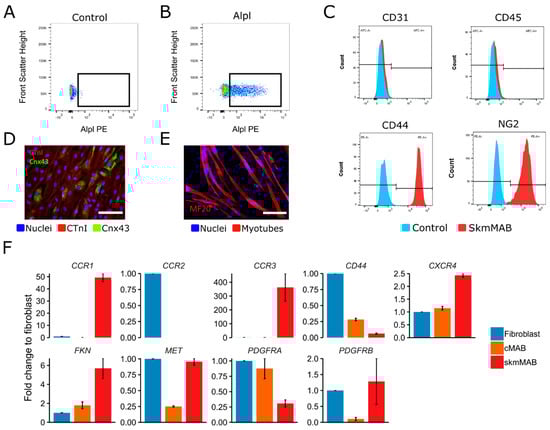 In order to evaluate if this migration axis is also important for cell therapy, we isolated cMABs from human cardiac muscle biopsies and skmMABs from human skeletal muscle biopsies. MABs were isolated by explant outgrowth and sorted for tissue non-specific alkaline phosphatase, liver/kidney/bone (ALPL) [] (Figure 7A). The isolation efficiency of MABs per biological replicate was dependent on their outgrowth and percentages of ALPL+ populations varied between five to sixty percent. Further characterization of skmMABs showed that they were all CD31 and CD45 negative, while they were positive for CD44 and NG2 (Figure 7B). cMABs differentiated into cardiomyocytes, as shown by immunofluorescence staining for Cardiac Troponin I (CTnI), however, the pattern of Connexin43 (Cnx43) showed that they were still premature (Figure 7C). skmMABs spontaneously formed myotubes upon myogenic differentiation (Figure 7D). We also showed that CCR1, CCR3, CXCR4, FKN and MET are expressed in cMAB and skmMABs and confirmed the expression of PDGFRB (Figure 7E). Human skin fibroblasts were used as a control cell type since they express the majority of these markers. In sum, we isolated and characterized human mesoangioblasts from cardiac and skeletal muscle and provide proof that they express PDGFRB.