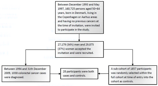 As previously described [20], the present study used a nested case-cohort design. Follow-up was based on population-based cancer registries. Between 1994 and 31 December 2009, 1038 CRC cases were diagnosed. A sub-cohort of 1857 persons was randomly selected within the full cohort at the time of entry into the cohort in agreement with the case-cohort study design [37] and, thus, without respect to time and disease status. Due to the study design, with a priori sampling of the sub-cohort, 28 persons were both cases and sub-cohort, and these persons were kept in the analyses. All 1038 CRC cases and 1857 sub-cohort members were included in the analysis. Flowchart of the participants is shown in Figure 1.