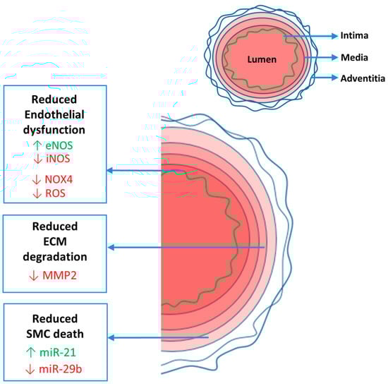 - Maegdefessel, L.; Azuma, J.; Toh, R.; Deng, A.; Merk, D.R.; Raiesdana, A.; Leeper, N.J.; Raaz, U.; Schoelmerich, A.M.; McConnell, M.V.; et al. MicroRNA-21 blocks abdominal aortic aneurysm development and nicotine-augmented expansion. Sci. Transl. Med. 2012, 4, 122ra22. [Google Scholar] [CrossRef] [PubMed]