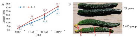 The effect of 2,4-dichlorophenoxyacetic acid (2,4-D) on the phenotype of cucumber fruit. (A) Cucumber fruit length over time. The number in the graph is the mean length of cucumber fruit of four replicates. Student’s t-test was used to determine the significance of the differential length of cucumber fruit between the 2,4-D group and the CK group at each time point. *, significant difference 0.01 < p < 0.05; **, extremely significant, p < 0.01. DBF, days before flowering; DAF, days after flowering. (B) Cucumber appearance at the harvest stage (14 DAF). S, stylar end; I, intermediate segment; P, peduncular end; R, expanded receptacle.