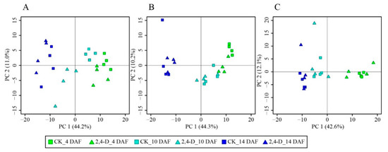 The PCA and OPLS-DA were performed with the SIMCA-P 13.0 software package using UV scaling. The Student’s t-test was employed to identify metabolites that differed significantly (P-value ≤ 0.05) between 2,4-D and CK groups using the log transformed data matrix (Table S1). The figures were edited using Adobe Illustrator CS5 software for better resolution.