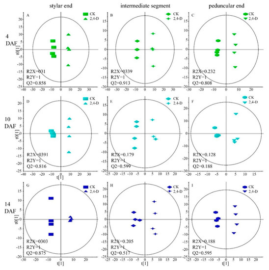 Orthogonal partial least squares projection to latent structures-discriminant analysis (OPLS-DA) score plots discriminating samples from the 2,4-D and CK group. Four biologycal replicates of each sample group were analyzed. (A–C) Score plots of the stylar, the intermediate segment and the peduncular end, respectively, at 4 DAF; (D–F) score plots of the stylar, the intermediate segment and the peduncular end, respectively, at 10 DAF; (G–I) score plots of the stylar, the intermediate segment and the peduncular end, respectively, at 14 DAF.