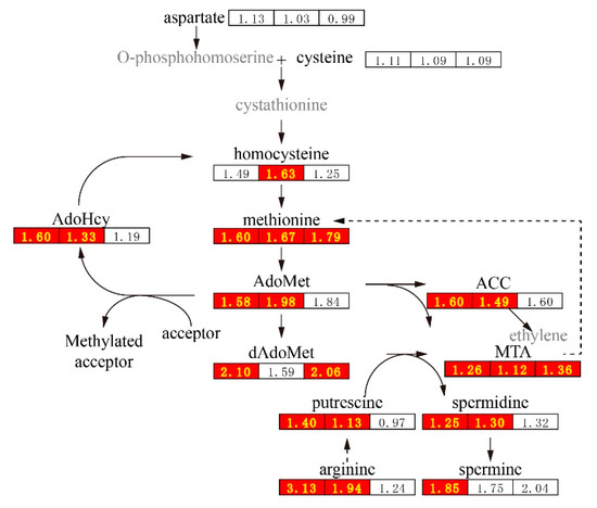 Methionine biosynthesis and metabolism pathway and the interlocked polyamine metabolism pathway that were up-regulated by 2,4-D at 4 DAF. AdoHcy, S-adenosylhomocysteine; AdoMet, S-adenosylmethionine; dAdoMet, S-adenosylmethioni- namine; MTA, 5-methylthioadenosine; ACC, 1-aminocyclopropane-1-carboxylate. The numbers in the cells are the ratios of fold changes (2,4-D group/CK group) using the average values of each group. The numbers from the left to the right are the ratios in the stylar end, the intermediate segment and the peduncular end, respectively. Red background indicates that metabolite levels was significantly higher in the 2,4-D group compared with the CK group.