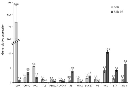 Microarray analysis validation by RT-qPCR. The expression levels of 15 selected genes were quantified by RT-qPCR at 8 h and 2 h PS. The y axis indicates the fold change in gene expression relative to the control plant at T8 h and T2 h PS. The expression profiles were similar by RT-qPCR and microarrays analysis. The data were obtained from three independent biological replicates and two technical repetitions. The numbers above the bars indicate the average fold change values with respect to the control conditions.