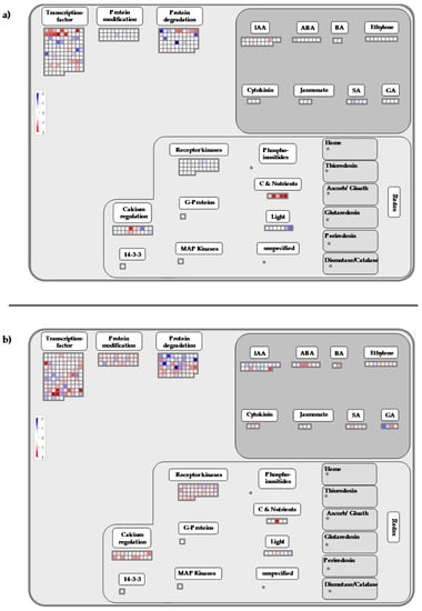 Mapman visualization of the regulation process pathway modulation at (a) 8 h and (b) 2 h PS.