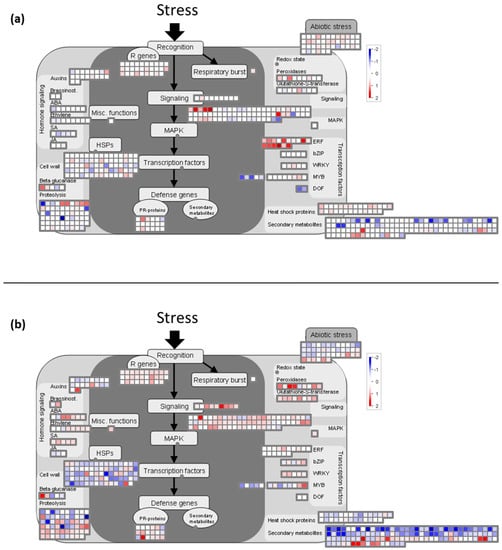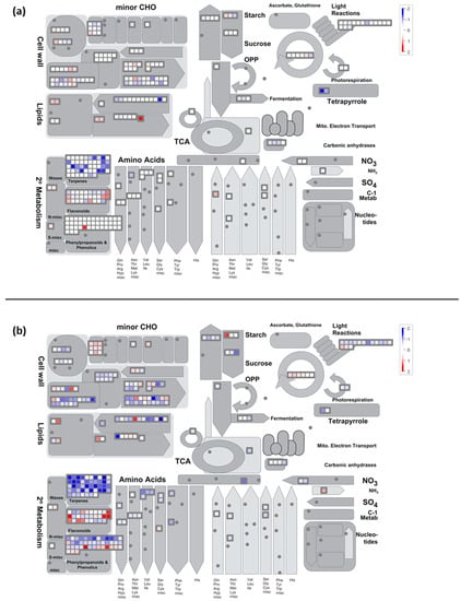 - Thimm, O.; Bläsing, O.; Gibon, Y.; Nagel, A.; Meyer, S.; Krüger, P.; Selbig, J.; Muller, L.A.; Rhee, S.Y.; Stitt, M. MAPMAN: A user-driven tool to display genomics data sets onto diagrams of metabolic pathways and other biological processes. Plant J. 2004, 37, 914–939. [Google Scholar] [CrossRef]