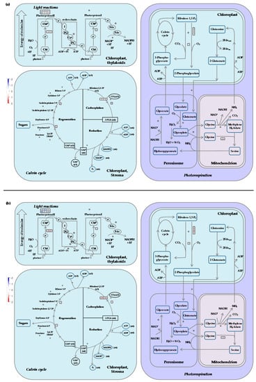 In our conditions, we noticed an over-expression of genes encoding a large subunit of ribulose-1,5-bisphosphate carboxylase/oxygenase 2 h PS (Rubisco; BIN 1.3.1 “PS.calvin cycle.rubisco large subunit”; p-value = 2.4 × 10−5; Supplementary file 8; Figure 5b and Figure 6b). These results are in agreement with a previous work on the grapevine leaf after 8 h of cold stress in the light [34]. At least, it seems that photosynthetic CO2 assimilation and/or photorespiration were not inhibited after the cold night.