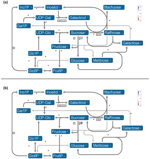 Mapman visualization of raffinose metabolism pathway modulation at (a) 8 h and (b) 2 h PS.