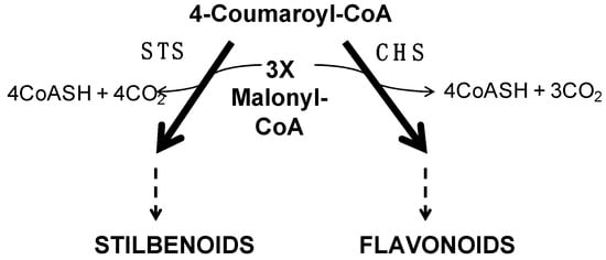 Pathways for stilbenoid and flavonoid biosyntheses adapted from Kodan et al. [159]. Stilbene synthase (STS) and chalcone synthase (CHS), respectively, led to stilbenoid and flavonoid biosynthesis from 4-Coumaroyl-CoA with three malonyl-CoAs.