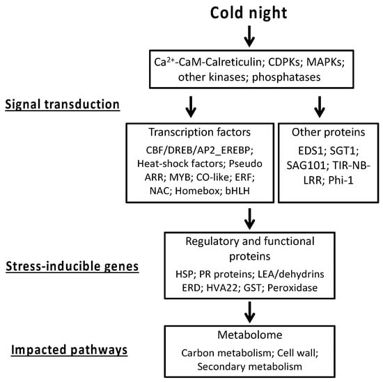Among various environmental stresses, low temperature is one of the most critical factors limiting the productivity and geographical distribution of plants. Low temperatures lead to decreased yields, stunted growth, and tissue damages during crop production [3] and can severely hamper reproductive development [4]. A generic pathway for the plant response to cold stress has been described in the literature. Briefly, an extracellular cold stress signal is initially perceived by membrane receptors/sensors, which in turn activate large and complex intracellular signaling networks leading to cold stress tolerance, either directly or indirectly. Indeed, plants have various ways to respond to cold stress, including changes in the composition, structure, and function of the plasma membrane and cell wall, cryoprotectant molecules’ synthesis, as well as an increase in the reactive oxygen species’ (ROS) scavenging activity [5,6,7,8]. Cold temperatures also lead to modifications of primary and secondary metabolic pathways [9,10,11]. Low temperatures activate a number of cold-inducible genes, such as those encoding dehydrins, lipid transfer proteins, translation elongation factors, and LEA proteins [4], as well as molecular chaperones’ HSPs [12,13]. LEA and HSPs are known to be involved in protecting macromolecules, such as enzymes and lipids [14]. In response to cold stress, several mechanisms are involved, including calcium-mediated signal transduction [15,16]. This results in cold-specific pathway activation and the induction of ICE (inducer of CBF Expression 1) expression and subsequently of CBF (C-repeat/DRE-Binding Factor) transcription factors, as well as Abscisic acid (ABA)-related metabolism activation [17]. The response to cold stress also includes an accumulation of osmoprotectants, such as sugars [18], amino acids (namely proline [19]), or also post-transcriptional regulation of proteins [20]. Abscisic acid (ABA) may also function as a secondary signal [15] and several TFs also respond to cold signals at the early stage during low-temperature exposure [21].
