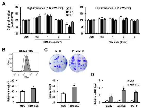 Photobiomodulation (PBM) enhances the proliferation and self-renewal of mesenchymal stem cells (MSCs). (A) Cell proliferation assays using MSCs treated with or without PBM at the indicated light parameters. As an irradiance of 7.12 mW/cm2 and a fluence of 1 J/cm2 were considered most beneficial to stimulate MSC proliferation, the following experiments were conducted using this condition. (B) Mitochondrial membrane potential of unconditioned MSCs (MSC; open histogram) and PBM-treated MSCs (PBM-MSC; filled histogram), as detected by rhodamine 123 (Rh123) fluorescence. (C) Clonogenic colony-forming unit-fibroblast (CFU-f) assay for MSC and PBM-MSC groups based on 0.5% crystal violet staining. (D) Relative mRNA expression of stemness-related genes in MSCs analyzed by real-time reverse transcription-polymerase chain reaction (RT-PCR). Data are presented as the mean ± standard error of the mean (SEM); n ≥ 3 per group. * p < 0.05 compared to the control.