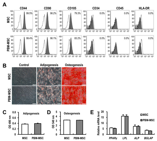 Photobiomodulation (PBM) maintains the immunophenotype and differentiation potential of mesenchymal stem cells (MSCs). (A) The immunophenotype of unconditioned MSCs (MSC) and PBM-treated MSCs (PBM-MSC). Percentage of positively-labeled cells for each surface marker (filled histogram) compared to an isotype control (open histogram), as determined by flow cytometry. (B) Representative images of undifferentiated MSCs and those differentiated into adipogenic or osteogenic lineages, treated with or without daily PBM. Scale bar = 100 μm. The degree of differentiation was quantified by measuring absorbance (C,D), and by the real-time RT-PCR analysis of differentiation markers (E). The mRNA expression levels are shown relative to those in undifferentiated controls as one. Data are presented as the mean ± SEM; n ≥ 3 per group.