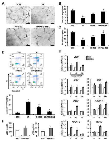 Endothelial cells are considered a prime target of radiation-induced toxicity to normal tissue, including the intestine [6]. We also identified that radiation exposure induces impaired angiogenesis in human umbilical vein endothelial cells (HUVECs) based on tube formation assays (Figure 3A). Moreover, with irradiated HUVECs, the PBM-preconditioned MSC-conditioned medium (MSC-CM) group showed a significant increase in total tube length and the number of branch points compared to those in the IR group (Figure 3B,C). Next, we investigated the protective effects of PBM-preconditioned MSC-CM with respect to radiation-induced endothelial apoptosis (Figure 3D). As shown in Figure 3D, MSC-CM treatment decreased the proportion of Annexin V and propidium iodide (PI)-double positive irradiated HUVECs. In addition, HUVEC apoptosis was further reduced by PBM-preconditioned MSC-CM treatment. MSCs synthesize a diverse array of cytokines, some of which greatly affect endothelial survival, growth, and angiogenesis [12]. Using real-time reverse transcription-polymerase chain reaction (RT-PCR), we examined the effect of PBM on proangiogenic gene expression in MSCs (Figure 3E). We found that PBM upregulated a subset of angiogenesis-related genes, including vascular endothelial growth factor (VEGF), hepatocyte growth factor (HGF), basic fibroblast growth factor (bFGF), platelet-derived growth factor (PDGF), angiopoietin (ANGPT)-1, ANGPT-2, and stromal cell-derived factor 1 alpha (SDF-1α). In addition, concentrations of VEGF and bFGF in the PBM-preconditioned MSC-CM were significantly higher than those in the MSC-CM, as determined by enzyme-linked immunosorbent assay (ELISA) (Figure 3F). Together, these data suggested that preconditioning MSCs with PBM enhances angiogenesis by inhibiting endothelial apoptosis and accelerating angiogenic factor production.