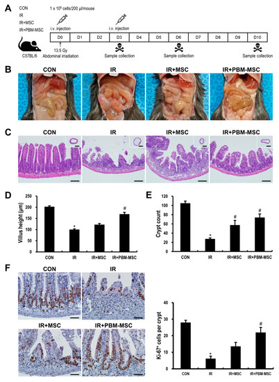 - Zhang, J.; Gong, J.F.; Zhang, W.; Zhu, W.M.; Li, J.S. Effects of transplanted bone marrow mesenchymal stem cells on the irradiated intestine of mice. J. Biomed. Sci. 2008, 15, 585–594. [Google Scholar] [CrossRef] [PubMed]