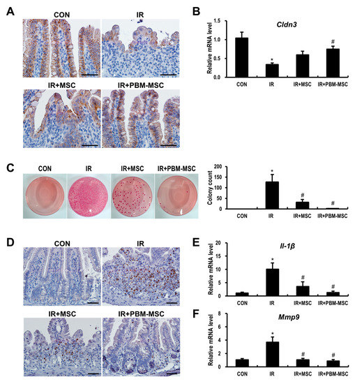 The disruption of epithelial integrity can lead to intestinal barrier dysfunction, which facilitates the parenteral access of enteric bacteria, thereby causing sepsis and even death [24]. As the epithelial integrity is controlled by multiple intercellular tight junction (TJ) molecules, we compared the expression of claudin 3 (Cldn3), which is one such TJ protein. The irradiated intestine showed weak immunoreactivity for Cldn3 when compared to that in controls (Figure 5A). However, this reduced Cldn3 expression was rescued by MSC treatment. Notably, the immunoreactivity of Cldn3 was further improved in the IR+PBM-MSC group, resulting in near-normal staining. In addition, the mRNA level of Cldn3 was significantly decreased following irradiation (0.4-fold compared to control levels), which was somewhat normalized by PBM-MSC treatment in the irradiated intestine (Figure 5B). We also evaluated bacterial translocation to the mesenteric lymph nodes, which is the first-pass organ encountered by translocating microorganisms (Figure 5C). Whereas the samples from control mice were sterile, a large number of colonies were observed in the IR group. Moreover, colony counts were significantly decreased in the IR+PBM-MSC group compared to that in the IR group. Next, we elucidated the anti-inflammatory effects of PBM-preconditioned MSCs using intestinal tissue exhibiting radiation-induced enteropathy. The accumulation of neutrophils in the intestine corresponds to the severity of inflammation in radiation enteritis [25]. Cells positive for myeloperoxidase (Mpo), which is a marker of activated neutrophils, were significantly increased in the intestine of the IR group compared to that in the control group (Figure 5D). However, PBM-MSC treatment attenuated the immunoreactivity of Mpo in the irradiated intestine. Interleukin (Il)-1β and matrix metallopeptidase (Mmp)9 expression are also markedly increased during acute inflammation after radiation exposure [26]. Based on our data, Il-1β and Mmp9 expression were significantly increased in the intestines of the IR group, whereas the levels of these inflammatory cytokines were decreased in the IR+PBM-MSC group (Figure 5E,F). Collectively, these data suggested that PBM-preconditioned MSCs attenuate intestinal barrier dysfunction and the inflammatory response during radiation-induced enteropathy.